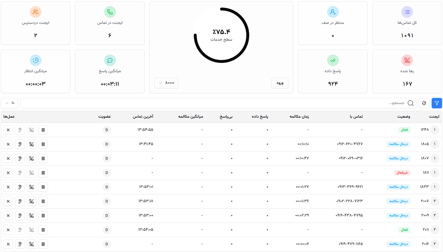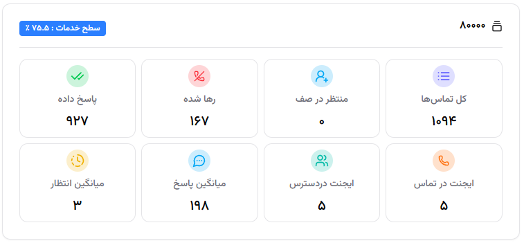 میانگین زمان انتظار، میانگین زمان مکالمه، درصد تماسهای بیپاسخ و شاخص Service Level (سطح خدمت) بهصورت عددی و نموداری نمایش داده میشود. -