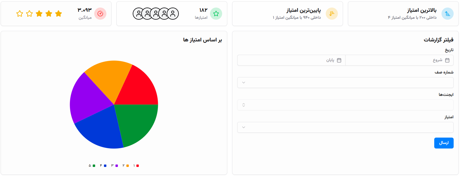 مدیران میتوانند با چند کلیک ساده میانگین امتیاز هر داخلی، صف یا حتی بازهی زمانی خاص را ببینند.
