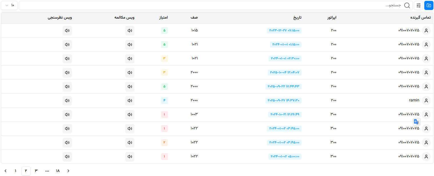 تمام این دادهها در داشبورد مدیریتی ذخیره میشوند تا بتوانید کیفیت عملکرد هر داخلی، اپراتور یا صف تماس را بسنجید.